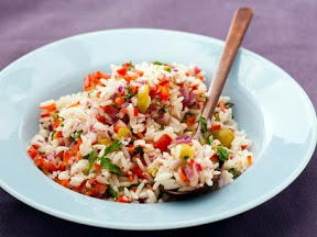 In a large bowl, combine the rice, olives, onion, parsley, sweet red pepper, and tomato and gently toss. Add the olive oil, vinegar, salt and pepper and toss again. Taste and adjust salt if needed. Serve at room temperature