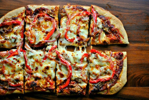 Spicy Three Cheese + Italian Sausage and Red Pepper Pizza