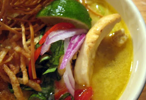 Khao Soi is a dish widely served in Thailand. Basically it’s a chicken curry soup. The fun is in the garnishes, which can range from deep-fried noodles to pickled cabbage, fried onion, hot peppers, fresh herbs, chopped veggies and more.