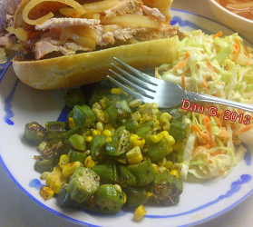 Fresh okra in my neck-of-the-woods is hard to come by. I buy it when I can find it. When I can't, I use frozen (which is what is shown in the picture shown alongside smoked pork loin sandwiches, spicy pickled onions, and Mother Daniel's Carolina Coleslaw.