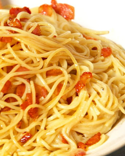 Bring a large pot of water to a boil over high heat and cook the spaghetti. Meanwhile, in a large skillet, cook the bacon over medium-low heat until just crispy, 8 to 10 minutes. Skim off some of the fat. Drain the pasta, add to the bacon in the pan, and toss to combine.