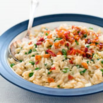 Omit butter, peas, and Parmesan. Cook 3 slices chopped bacon in pot over medium-high heat until crisp, about 5 minutes; transfer to paper towel–lined plate. Add onion to rendered bacon fat and cook as directed. Stir in 2 thinly sliced scallions and sprinkle with crisp bacon before serving.