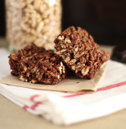 3. Line an 8x8 in pan with parchment paper and press chocolate puffs mixture into pan. Spread evenly and press down firmly using another piece of parchment paper. Freeze at least 30 minutes before cutting into squares. Store in air-tight container in freezer.