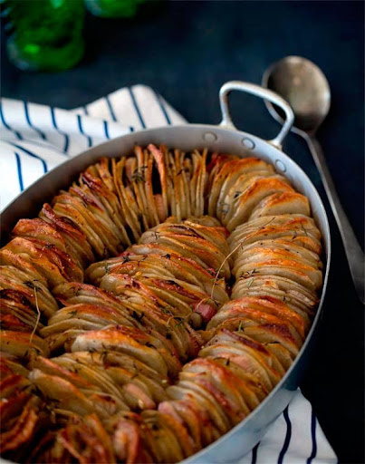 1. Preheat oven to 375 degrees. In a small bowl, combine butter and oil. Brush bottom of a round 9-inch baking dish with some butter mixture. With a sharp knife or mandoline, slice potatoes very thinly crosswise.