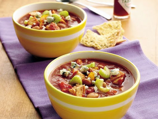 2Stir in remaining ingredients except celery and blue cheese. Heat to boiling; reduce heat to medium-low. Simmer uncovered 10 to 15 minutes, stirring occasionally. Serve topped with celery and blue cheese.