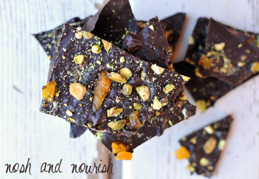 5. Then, pour the chocolate mixture flat onto a parchment lined cookie sheet. Spread flat with a spoon or spatula. Sprinkle pistachios and apricots evenly onto chocolate. Gently press the toppings into the chocolate.