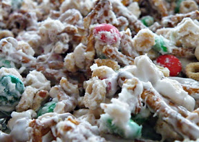 Mix cereal, pretzels, nuts. Melt white chocolate chips and pour over mixture. Stir in M & M 's. Place on foil until hard. Break into small pcs and store in a cool place.