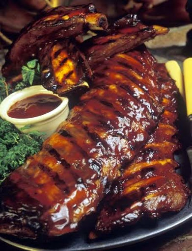 When ready to eat, preheat the broiler for 5 minutes and broil the ribs, basting with the sauce. They should become crisp and charred, about 5 minutes on each side. Pick the onion and garlic out of the sauce and serve with ribs.