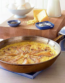 Pour the egg mixture over the potatoes and place the pan in the center of the oven. Bake the frittata until it is browned and puffed, 50 minutes to 1 hour. It will be rounded and firm in the middle and a knife inserted in the frittata should come out clean. Serve hot.