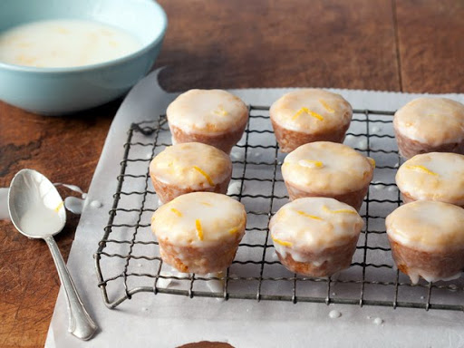 To make the glaze, sift the sugar into a mixing bowl. Add the lemon juice, zest, oil, and 3 tablespoons water. Mix with a spoon until smooth.