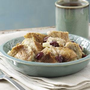 In a 3-qt. slow cooker coated with cooking spray, combine the bagels, apple, cranberries and raisins. In a large bowl, whisk the milk, egg substitute, sugar, butter, cinnamon and vanilla. Pour over bagel mixture and stir to combine; gently press bagels down into milk mixture.