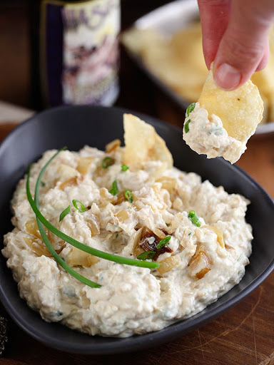 Add the cream cheese, sour cream, caramelized onions, remaining porter, black pepper, smoked paprika and garlic powder to a food processor. Pulse until smooth but still with a few chunks. Add the green onions and pulse once or twice to combine.