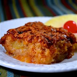 Combine the flour, white sugar, egg, baking soda, vanilla and undrained fruit cocktail. Mix until blended. Pour batter into the prepared pan and sprinkle the top with the brown sugar.