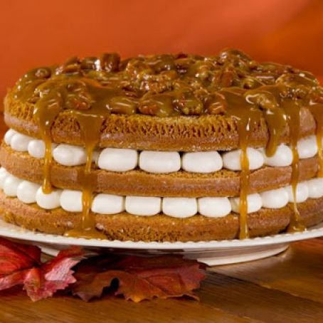 Pumpkin Pecan Praline Torte featuring layers of pumpkin cake and cream cheese frosting drizzled with a scrumptious pecan praline topping.