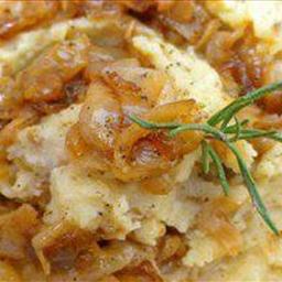 Meanwhile, put the cauliflower in a covered casserole dish along with 1 tablespoon water. Cover and microwave on HIGH power 5 minutes. Stir, then microwave another 5 minutes or until very tender. Let stand covered 5 minutes then drain any excess water. Put the cauliflower in a food processor with the chopping blade inserted. Add the cream and a little salt and process until very smooth. Transfer to a serving bowl and stir in the caramelized onions. Adjust the seasoning with salt, if needed.