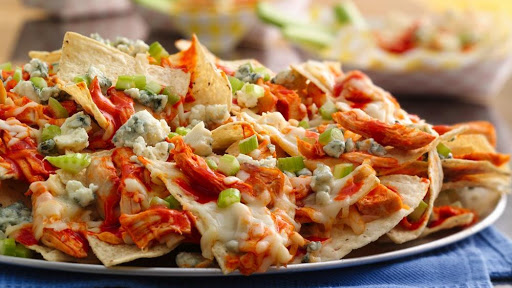 To serve; slide one pan of nachos off onto other pan to make one large mound of nachos. Serve immediately.