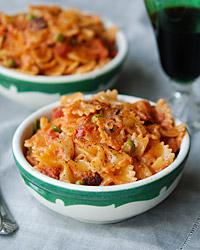 In a large, deep skillet, cook the bacon over moderate heat, stirring occasionally, until browned and nearly crisp, about 8 minutes. Add the onion and crushed red pepper, season with salt and cook, stirring occasionally, until the onion is golden, about 10 minutes. Add the garlic and cook until fragrant, 1 minute. Carefully add the vodka and cook, scraping up any browned bits on the bottom of the skillet. Add the tomatoes with their juices and bring to a boil. Cover and simmer over moderate heat, stirring occasionally, until the tomatoes start to break down, about 10 minutes. Uncover and simmer until reduced slightly, about 5 minutes longer. Stir in the cream and peas and cook, stirring occasionally, until the sauce is slightly thickened, about 5 minutes. Stir in the basil and season with salt and pepper.