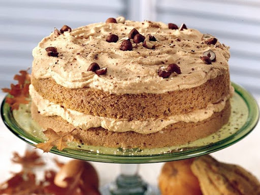 Place one cake layer, rounded side down, on serving plate. Spread with 1 1/2 cups pumpkin cream. Top with second cake layer, rounded side up. Spread remaining pumpkin cream around side of cake. Spread reserved pumpkin cream on top of cake. Sprinkle with 1/2 cup chopped hazelnuts. Refrigerate 1 hour before serving. Refrigerate any remaining cake.