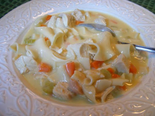 Now add the (10-ounce) or 2 (6-ounce) cans cooked and chopped chicken, and noodles. Cover and simmer for 5 to 6 minutes or until noodles are tender, stirring occasionally.
