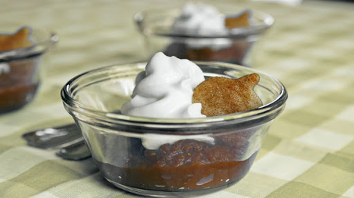 Divide pumpkin pie mixture evenly among 8 small custard cups. Top each with a dollop of whipped cream and a pumpkin cracker.