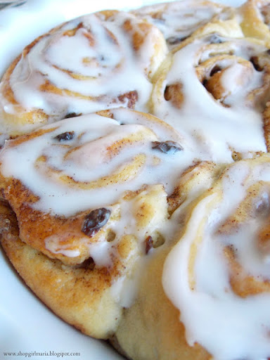 5. Bake for 20 - 30 minutes, depending on your oven, until the edges are golden brown and the center has baked through. Let the buns cool for about 10 minutes, and prepare your glaze while they are cooling. Combine confectioners' sugar, melted butter, vanilla extract and milk in a small bowl (make sure there are no lumps in the glaze), then drizzle over the buns! Serve warm!
