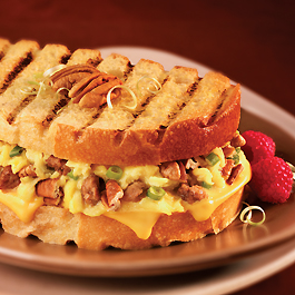 TIP: Panini are Italian sandwiches, generally pressed and pan-grilled, made with a variety of fillings, especially leftovers. While a panini-maker or grill pan is ideal for their preparation, this breakfast version, which pairs nutty pecans with a classic morning-food mixture of eggs, onions, cheese, and sausage, can also be cooked in a standard skillet.