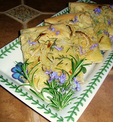 A wonderful recipe for a traditional Italian Focaccia. I have added fresh rosemary which happens to be in bloom now, adding the flowers to the top makes for a pretty presentation.