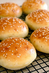 Set a large metal pan of water on the lowest rack of the oven.  Preheat the oven to 400˚ F with a rack in the center.  Brush the tops of the buns lightly with the egg wash and sprinkle with sesame seeds.  Bake the buns about 15 minutes rotating halfway through baking, until the tops are golden brown.  Transfer to a rack to cool completely.