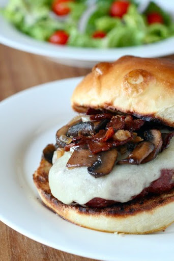 Grill the burgers, 3-5 minutes per side, until cooked through and no longer pink (160˚ F on an instant read thermometer). Place a slice of provolone on top of each patty during the last few minutes of cooking. Toast the burger buns on the grill until light golden. Assemble the burgers on the buns and spoon the Marsala topping over the patties. Serve immediately.