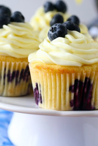 To make the frosting, combine the cream cheese and butter in the bowl of an electric mixer. Beat on medium-high speed until well combined and smooth, about 2-3 minutes. Mix in the lemon juice and lemon zest. Gradually beat in the confectioners’ sugar until totally incorporated, increase the speed and then beat until smooth. Frost cooled cupcakes as desired. (I used a large, unlabeled star tip to frost these cupcakes.) Garnish with fresh blueberries.