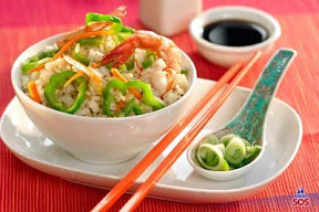 - Pincele un wok caliente con aceite y agregue la pechuga de pollo previamente cortada en finas tiras, el ajo y jengibre, saltee y una vez que los ingredientes comiencen a dorarse incorpore los camarones, cocine durante 5 minutos mas y agregue la cebolla de verdeo picada, el omelette picado y el arroz, saltee y condimente con salsa de soja, sal y pimienta, mezcle bien para que se incorporen todos los sabores.
