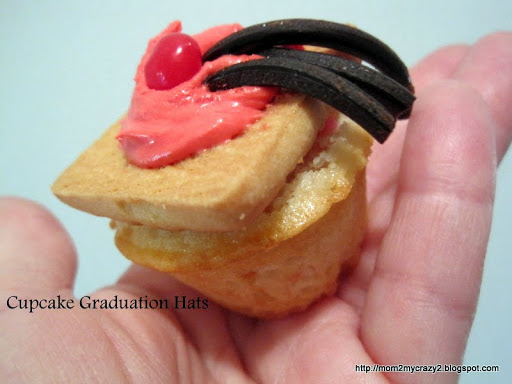 4 Tint frosting with food color to match paper baking cups. Frost bottoms of cookies. Place 1 candy on center of each. For each mortarboard, place small dollop of frosting on bottom of cupcake; top with cookie. Press 3 or 4 pieces of licorice into frosted cookie next to candy. Store loosely covered.