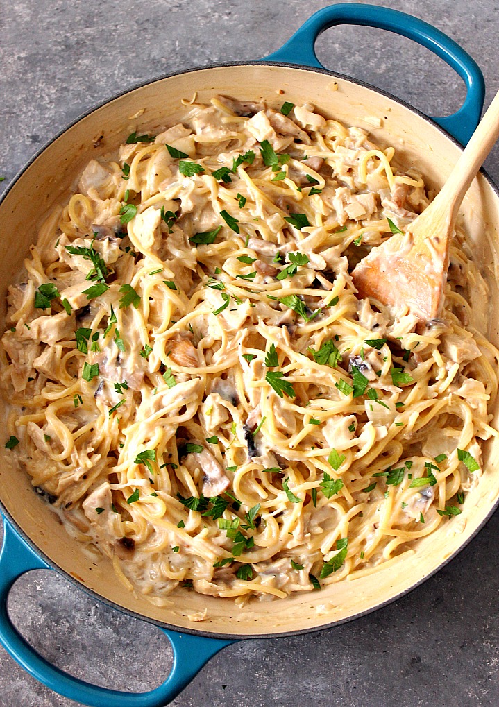 Quick and easy dish with leftover turkey meat, creamy mushroom garlic sauce and noodles. All cooks in one pan!