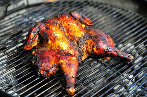 2. When the charcoal is fully lit and covered in gray ash, pour coals out and arrange them on one side of the charcoal grate, keeping the other side empty. Place the chicken over the cool side of the grill, skin side down, and brush exposed side with the wet rub. Flip the chicken over and brush the other side with the rub. Cover the grill and cook, basting occasionally with any remaining rub, at 350 degrees until an instant read thermometer reads 165 degrees when inserted into the thickest part of the breast, about 45 minutes. Remove the chicken from the grill and allow to rest for 10 to 15 minutes.