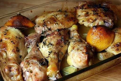 Twenty to thirty minutes before the time is done, pour reserved lemon juice mixture over chicken and add the rosemary sprigs. (Rosemary tends to get bitter and antiseptic tasting if cooked the entire time in the slow-cooker.)