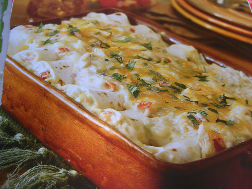 Spoon about 1/3 c. mixture down center of each tortilla. Roll up & place seam side down in prepared baking dish. Pour remaining mixture over enchiladas; sprinkle w/ remaining 1 1/2 c. shredded cheese.