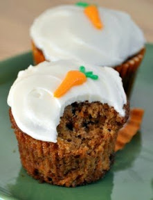 Spread frosting evenly on top of cupcakes, setting aside no more than 1/3 cup to make carrots for decoration.