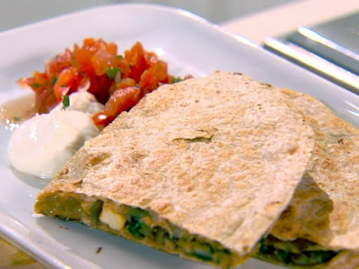 Lay 1 tortilla on a flat work surface and sprinkle with 1/4 cup shredded cheese. Spoon 1/2 chicken and vegetable mixture on top of cheese, then top with an additional 1/4 cup cheese. Top with another flour tortilla. Heat a large nonstick skillet with cooking spray over medium heat. Carefully place 1 quesadilla in pan and cook 3 minutes. Using a large spatula, gently flip quesadilla and cook an additional 3 minutes until lightly browned and cheese is melted. Repeat with second quesadilla. Slice each quesadilla into quarters. Place 2 quarters on a plate with 1 tablespoon sour cream and 2 tablespoons salsa.