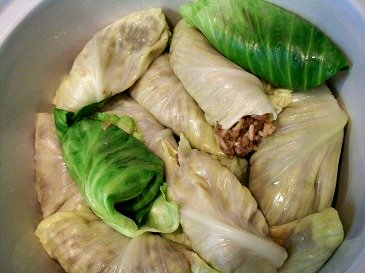 Taking one cabbage leaf at a time, add a spoon or more of the meat mixture. Using your hand, gather the meat on one end of the cabbage leaf and then roll the leaf.
