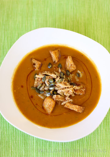 Serve the soup topped with crunchy fried onions, pumpkin seeds, croutons, and a drizzle of chile oil.