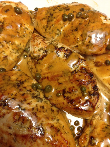 3.Return skillet to stove, turn heat to high. Whisk in heavy cream and lemon juice continously until reduced to sauce consistency, about 3 minutes. Remove from heat, stir in capers. Pour sauce over chicken and serve