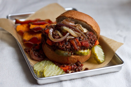 Place pickles on the bottom of a hamburger bun, then scoop the sloppy joe mixture on top, and then top with caramelized onions and the top bun.