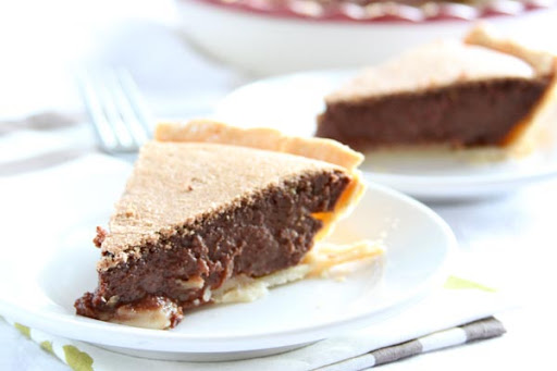 4. Pour batter into pie crust and bake in oven for 1 hour 15 minutes to 1 hour 30 minutes or until the pie is crisp on top and a knife inserted in the center comes out with a little moist chocolate on it.