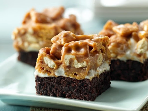 2 In 3-quart saucepan, heat corn syrup, butter, peanut butter chips and vanilla over medium heat 3 to 4 minutes, stirring constantly, until chips are melted. Remove from heat; stir in snack mix. Spread evenly over marshmallows. Refrigerate about 45 minutes or until firm. For brownies, cut into 5 rows by 5 rows.