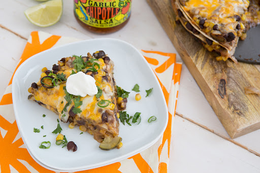 Place a tortilla on the bottom of the springform pan. Top it with 1/4 of the veggie mixture, 1/2 cup of cheese, and another tortilla. Repeat with each tortilla; top the last layer with a cup of cheese. Bake for about 20 minutes, or until the cheese has melted and is just beginning to brown. Cut the pie into 6 wedges and serve with cilantro, green onions, lime wedges, salsa and/or sour cream.
