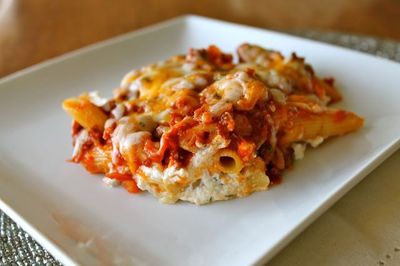 In a 9x13 pan that has been sprayed with cooking spray, add 1/2 of the noodles. Spread the cheese mixture over the top of the noodles. Add the other 1/2 of the noodles and top with the meat sauce.
