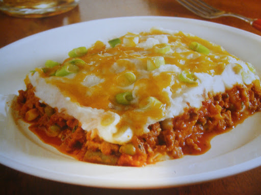 Transfer mixture to prepared dish. Spoon potatoes evenly over top. Sprinkle w/ green onions and cheese. Coat sheet of foil w/ cooking spray. Cover dish w/ foil, sprayed side down, to prevent cheese from sticking. Bake 22-25 mins. or till bubbly and cheese is melted.
