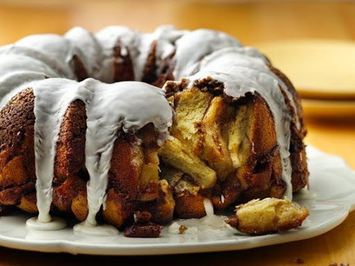 Heat oven to 350°F. Spray 12-cup fluted tube cake pan with CRISCO® Original No-Stick Cooking Spray. In small bowl, mix crushed granola bars, pecans and 1/2 teaspoon of the cinnamon. Sprinkle mixture evenly in bottom of pan.