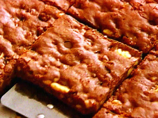 Bake for 20 minutes, then rap the baking sheet against the oven shelf to force the air to escape from between the pan and the brownie dough. Bake for about 15 minutes, until a toothpick comes out clean. Do not overbake! Allow to cool thoroughly, refrigerate, and cut into 20 large squares.