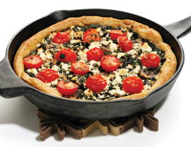 3. Preheat oven to 475°F. Oil bottom and sides of 12-inch cast iron skillet. With floured hands, pat and stretch Dough over bottom and halfway up sides of skillet. Let dough rest 5 minutes. Spread kale mixture on dough; scatter feta cheese, tomatoes, and oregano on top. Place skillet directly on oven floor, and bake 15 minutes. Remove carefully from oven, and let stand 5 minutes before serving.